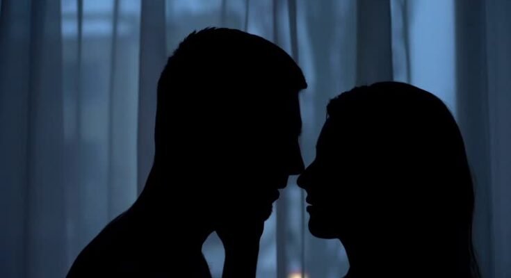 Couple shadow tenderly kissing in twilight room, nightlife intimacy, feelings